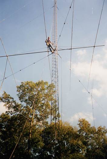 |  | Joe K3NM working at the 40m level. This tower is reserved for the 20 and 40m stacks. |
