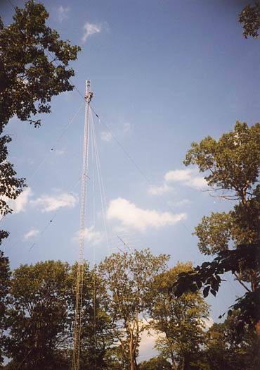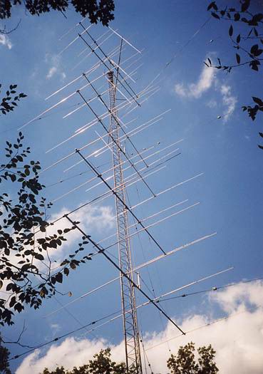|  | The 10 and 15m Hygain 4-stacks sharing one 40m tower. The top antennas are rotary while all others are fixed to EU. One of the upper 15m Yagis is turned around for repair. |