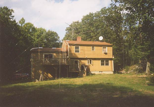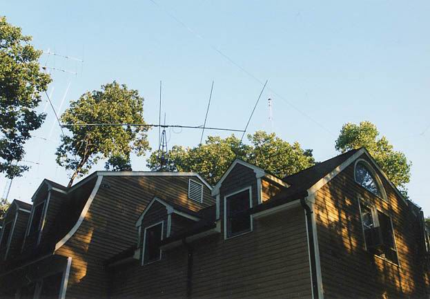 |  | Bobīs house with a 15m 4el Yagi on a tripod. Before 1999 this has been the only rotary antenna at KQ2M! There is an assortment of fixed wire Yagis for 10-40m when you look up to the sky! Several vertical arrays for 40-160m hung between trees complete the antenna farm. |