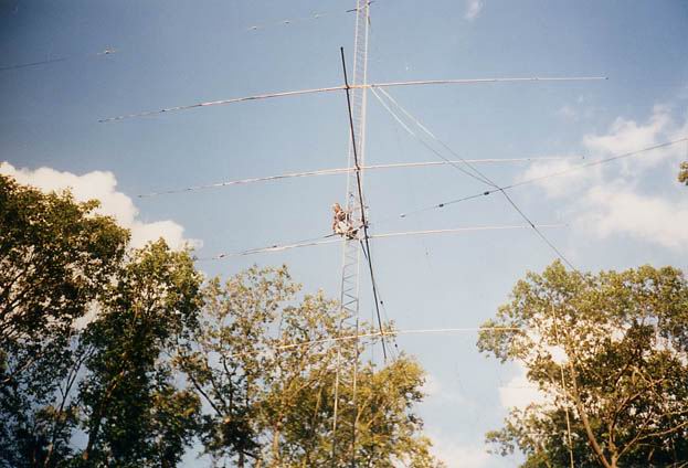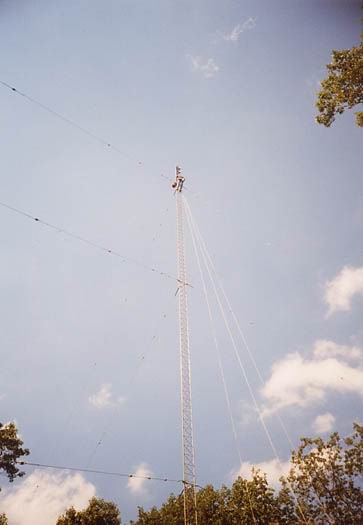 |  | Joe K3NM working at the 40m level. This tower is reserved for the 20 and 40m stacks. |